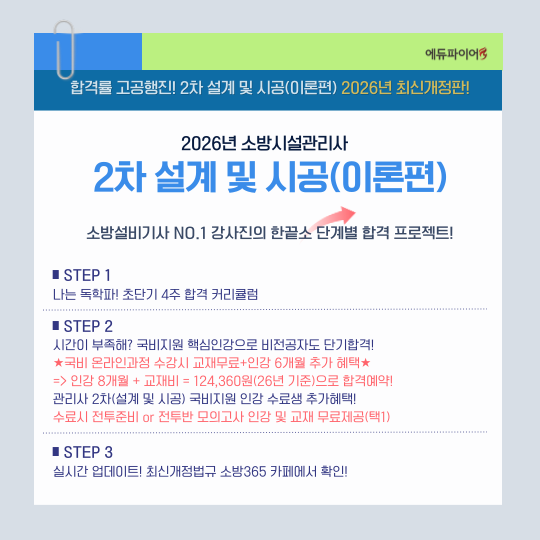 | 상품설명 | (필독!!) [교재 구매 방법] (1) 점검실무행정 1과목 응시 => 점검실무행정 1권 구매 (2) 설계 및 시공 1과목 응시 => 설계 및 시공(이론편) 1권 + 설계 및 시공(계산문제편) 1권 구매 (3) 점검실무행정과 설계 및 시공 모두 응시 => 점검실무행정 1권 + 설계 및 시공(계산문제편) 구매 ※ 점검실무행정과 설계 및 시공(이론편) 교재에 화재안전기술기준 내용이 포함되어 있습니다! ![]() ![]() |