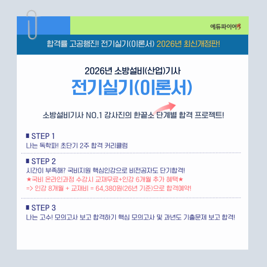 | 목차 | ▣ 목차 chapter 1 도면 1. 전선가닥수 01 자동화재탐지설비 ∙핵심기출문제 02 비상방송설비 ∙핵심기출문제 03 옥내소화전 ∙핵심기출문제 04 스프링클러설비(준비작동식) ∙핵심기출문제 05 가스계소화설비 ∙핵심기출문제 06 제연설비 ∙핵심기출문제 07 제연창설비 & 자동방화문설비 ∙핵심기출문제 08 2가지 이상 복합설비 ∙핵심기출문제 2. 결선도 01 자동화재탐지설비 ∙핵심기출문제 02 비상방송설비 ∙핵심기출문제 03 Super Visory Panel 및 가스계소화설비 ∙핵심기출문제 04 유도등 ∙핵심기출문제 05 자동방화문 ∙핵심기출문제 chapter 2 소방시설의 기능 및 특성 1. 경보설비 01 자동화재탐지설비(감지기) ∙핵심기출문제 02 자동화재탐지설비(수신기) ∙핵심기출문제 03 자동화재탐지설비(기타) ∙핵심기출문제 04 자동화재속보설비 ∙핵심기출문제 05 단독경보형 감지기 ∙핵심기출문제 06 비상방송설비 ∙핵심기출문제 07 누전경보기 ∙핵심기출문제 08 가스누설경보기 ∙핵심기출문제 2. 소화설비 01 수계소화설비 ∙핵심기출문제 02 가스계소화설비 ∙핵심기출문제 3. 피난구조설비 01 유도등 및 피난유도선 ∙핵심기출문제 02 비상조명등 및 휴대용 비상조명등 ∙핵심기출문제 4. 소화활동설비 01 비상콘센트설비 ∙핵심기출문제 02 무선통신보조설비 ∙핵심기출문제 5. 건축법 관련설비 01 배연창설비 ∙핵심기출문제 02 자동방화셔터 ∙핵심기출문제 6. 기타 01 지하구 02 공동주택 03 창고시설 04 화재알림설비 05 전원설비 ∙ 핵심기출문제 06 기타 ∙ 핵심기출문제 chapter 3 계산문제 01 전동기 용량 ∙핵심기출문제 02 전력용 콘덴서의 용량 ∙핵심기출문제 03 V결선 시의 단상변압기 1대 용량 ∙핵심기출문제 04 조명 ∙핵심기출문제 05 단상 2선식 전력 ∙핵심기출문제 06 전동기의 동기⋅회전 속도 ∙핵심기출문제 07 감시전류, 작동전류 ∙핵심기출문제 08 비상용 자가발전기의 용량, 차단기의 용량 ∙핵심기출문제 09 누설전류 ∙핵심기출문제 10 전선의 단면적 및 전압강하 ∙핵심기출문제 11 축전지의 용량 ∙핵심기출문제 12 2차 충전전류 및 2차 출력 ∙핵심기출문제 13 합성정전용량(콘덴서 직렬접속 시) ∙핵심기출문제 14 전선의 전기저항 및 전선의 저항온도계수 ∙핵심기출문제 15 분기회로수 ∙핵심기출문제 chapter 4 시퀀스제어 01 논리회로&타임차트 ∙핵심기출문제 02 소방관련 시퀀스 응용회로 ∙핵심기출문제 chapter 5 간선설비 및 배선시공기준 01 전선 ∙핵심기출문제 02 금속관⋅가요전선관⋅합성수지관 공사 ∙핵심기출문제 03 접지공사 ∙핵심기출문제 04 소방용 배선 ∙핵심기출문제 |