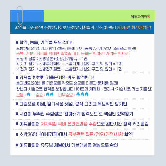 Part 1 소방전기회로 Chapter 01 직류회로 Chapter 02 자기회로 Chapter 03 정전기와 콘덴서 Chapter 04 교류회로 Chapter 05 비정현파 교류 Chapter 06 과도현상 Chapter 07 자동제어 Chapter 08 반도체소자 Chapter 09 기타 Part 2 소방전기시설의 구조 및 원리 Chapter 01 경보설비 Chapter 02 피난구조설비 Chapter 03 소화활동설비 Chapter 04 기타 소방전기설비 등 부록. 핵심 모의고사, 과년도 출제문제 핵심 모의고사 3회 2022년 과년도 출제문제 2021년 과년도 출제문제 2020년 과년도 출제문제 2019년 과년도 출제문제 2018년 과년도 출제문제 2017년 과년도 출제문제 2016년 과년도 출제문제 2015년 과년도 출제문제 2014년 과년도 출제문제 |