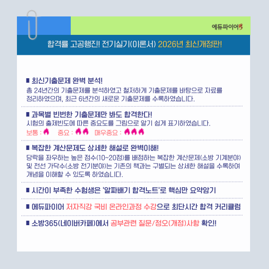 | 목차 | ▣ 목차 chapter 1 도면 1. 전선가닥수 01 자동화재탐지설비 ∙핵심기출문제 02 비상방송설비 ∙핵심기출문제 03 옥내소화전 ∙핵심기출문제 04 스프링클러설비(준비작동식) ∙핵심기출문제 05 가스계소화설비 ∙핵심기출문제 06 제연설비 ∙핵심기출문제 07 제연창설비 & 자동방화문설비 ∙핵심기출문제 08 2가지 이상 복합설비 ∙핵심기출문제 2. 결선도 01 자동화재탐지설비 ∙핵심기출문제 02 비상방송설비 ∙핵심기출문제 03 Super Visory Panel 및 가스계소화설비 ∙핵심기출문제 04 유도등 ∙핵심기출문제 05 자동방화문 ∙핵심기출문제 chapter 2 소방시설의 기능 및 특성 1. 경보설비 01 자동화재탐지설비(감지기) ∙핵심기출문제 02 자동화재탐지설비(수신기) ∙핵심기출문제 03 자동화재탐지설비(기타) ∙핵심기출문제 04 자동화재속보설비 ∙핵심기출문제 05 단독경보형 감지기 ∙핵심기출문제 06 비상방송설비 ∙핵심기출문제 07 누전경보기 ∙핵심기출문제 08 가스누설경보기 ∙핵심기출문제 2. 소화설비 01 수계소화설비 ∙핵심기출문제 02 가스계소화설비 ∙핵심기출문제 3. 피난구조설비 01 유도등 및 피난유도선 ∙핵심기출문제 02 비상조명등 및 휴대용 비상조명등 ∙핵심기출문제 4. 소화활동설비 01 비상콘센트설비 ∙핵심기출문제 02 무선통신보조설비 ∙핵심기출문제 5. 건축법 관련설비 01 배연창설비 ∙핵심기출문제 02 자동방화셔터 ∙핵심기출문제 6. 기타 01 지하구 02 공동주택 03 창고시설 04 화재알림설비 05 전원설비 ∙ 핵심기출문제 06 기타 ∙ 핵심기출문제 chapter 3 계산문제 01 전동기 용량 ∙핵심기출문제 02 전력용 콘덴서의 용량 ∙핵심기출문제 03 V결선 시의 단상변압기 1대 용량 ∙핵심기출문제 04 조명 ∙핵심기출문제 05 단상 2선식 전력 ∙핵심기출문제 06 전동기의 동기⋅회전 속도 ∙핵심기출문제 07 감시전류, 작동전류 ∙핵심기출문제 08 비상용 자가발전기의 용량, 차단기의 용량 ∙핵심기출문제 09 누설전류 ∙핵심기출문제 10 전선의 단면적 및 전압강하 ∙핵심기출문제 11 축전지의 용량 ∙핵심기출문제 12 2차 충전전류 및 2차 출력 ∙핵심기출문제 13 합성정전용량(콘덴서 직렬접속 시) ∙핵심기출문제 14 전선의 전기저항 및 전선의 저항온도계수 ∙핵심기출문제 15 분기회로수 ∙핵심기출문제 chapter 4 시퀀스제어 01 논리회로&타임차트 ∙핵심기출문제 02 소방관련 시퀀스 응용회로 ∙핵심기출문제 chapter 5 간선설비 및 배선시공기준 01 전선 ∙핵심기출문제 02 금속관⋅가요전선관⋅합성수지관 공사 ∙핵심기출문제 03 접지공사 ∙핵심기출문제 04 소방용 배선 ∙핵심기출문제 |